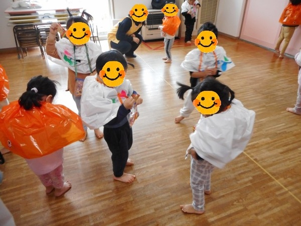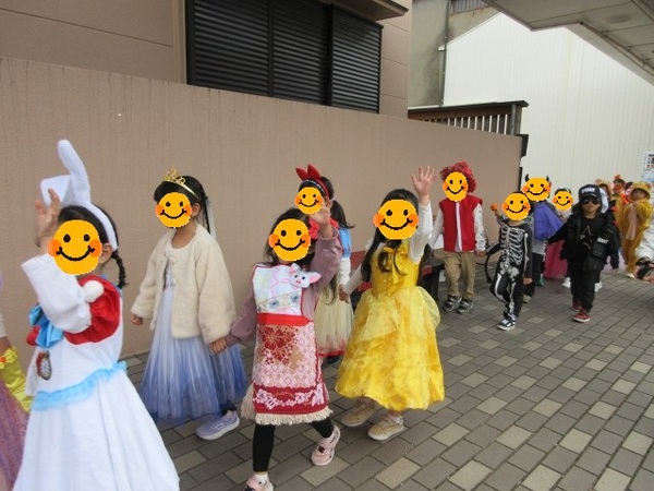 10月31日(金) Halloweenパーティーをしました!🎃星組さん(5歳児)、月組さん(4歳児)、花組さん(3歳児)は、楽しみにしていた仮装をし、天気も良かったので商店街をパレードしてきまし‼車から手を振ってくれる方や、商店街の方から声をかけてもらったり、楽しく歩いてきました🎵園にもどってからは、各保育室のゲームを楽しみ、その後は仲良し給食(縦割り保育)でいつもと違うお部屋、お友だちと一緒に食べました🍴。とっても楽しいひと時を過ごすことができました✨