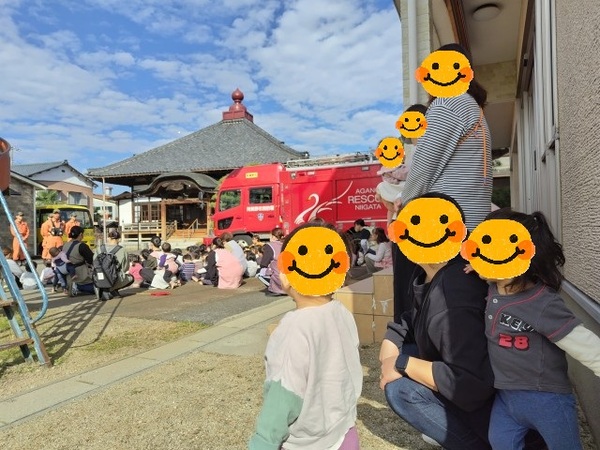 こんにちは。たちばなひよっこクラブです🐣寒さが厳しくなってきて冬の訪れを感じる季節になりましたね🍂先月は避難訓練に参加しました!こども園のお友だちが園庭に避難してきたり、消防車🚒も来たりして、ひよっこのお友だちも興味津々に見ていました👀そして、消防車と一緒に写真も撮りました📸