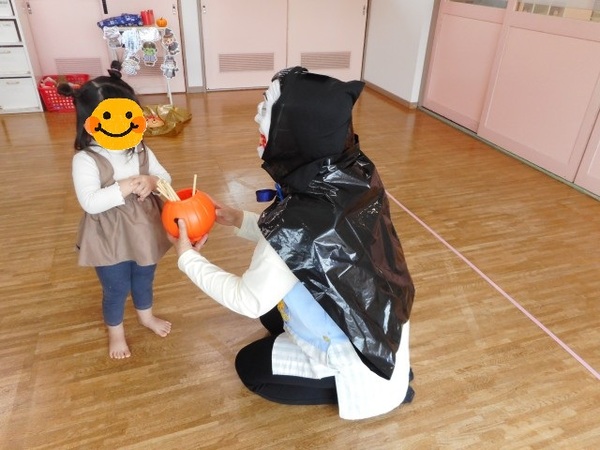 ゆり組さん(2歳児)、すみれ組さん(1歳児)、もも組さん(0歳児)も可愛く仮装し、もも組さんはオバケ風船であそんだり👻、すみれ組さんはオバケさんからキャンディーをもらったり🍭、ゆり組さんはお菓子を探してゲットしたり🍪、小さいながらもハロウィンの雰囲気を楽しむことができました✨ 👻 Happy Halloween‼ 🎃