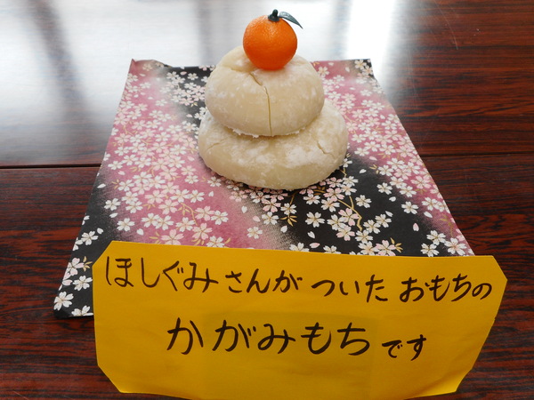 1月9日(金) 全園児がお遊戯場に集まり、楽しみに待っていた毎年恒例のもちつきが行われました!重〜い木の臼と杵。そして、もち米を見せるといい匂いが漂い、子どもたちは興味津々。星組さん(年長児)役員のお父さんたちにお手伝いに来てもらいもちつきがスタートしました!最初にお父さんたちの出番です。子どもたちの声援をうけ、ドスン!ドスン!と、もちをつく姿はとても迫力がありかっこ良かったです✨次に、星組さんも「よいしょ!よいしょ!」とみんなから応援してもらい、張り切ってついてる子、ドキドキしながらついてる子と様々でしたが、全員がもちつきをすることが出来ました✨ついたおもちは『鏡もち』にして飾りました😆